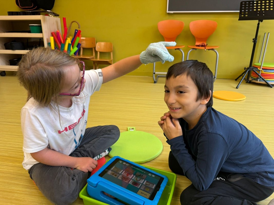 mit Sprachprogrammen, Kommunikationstafeln und Gebärden.